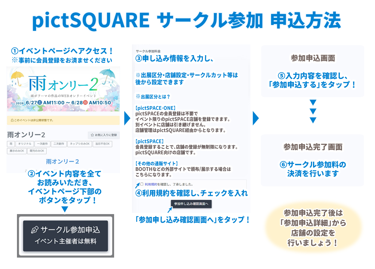 【pictSPACE-ONE-】…pictSPACEの会員登録は不要で、イベント限りのpictSPACE店舗を登録できます。別イベントには店舗は引き継げません。店舗管理はpictSQUARE経由からとなります。