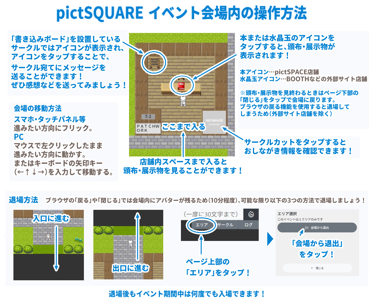 ※ブラウザの戻る・閉じる機能を使用するとアバターが会場に残されたままになります(10分程度)
