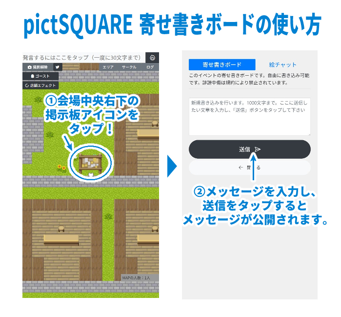 イベント会場の中央右に設置されている掲示板のアイコンが寄せ書きボードです。絵チャット機能もあります。